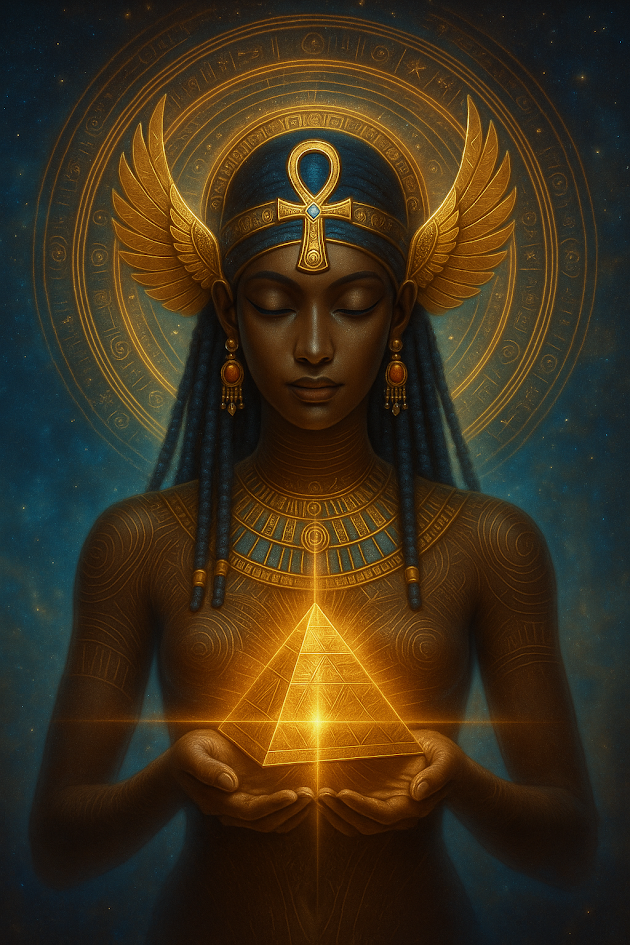 Face à toi, un homme égyptien aux allures divines. Son torse nu est marqué de symboles chamaniques: l'Œil d'Horus, le scarabée sacré, des lignes dorées traçant la carte invisible de l'énergie. Son regard est calme, concentré. Il est prêtre-masseur, guérisseur des corps et des âmes.