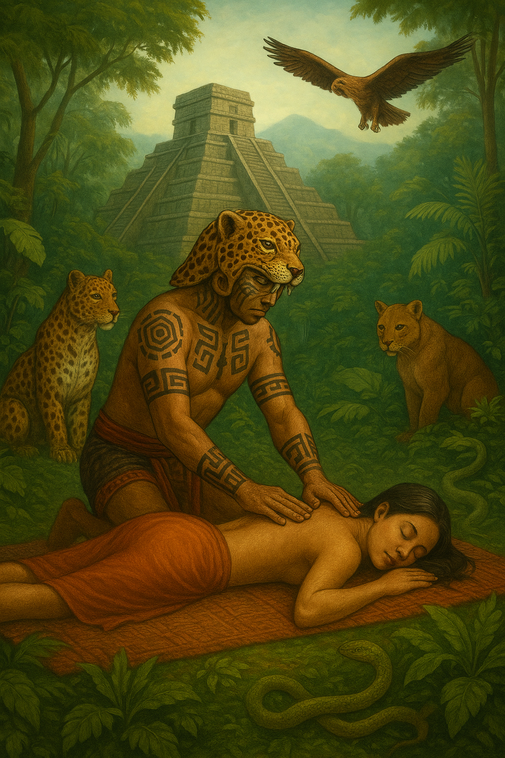 Un gardien des savoirs ancestraux s'approche. Sa présence est douce et puissante à la fois. Il t'offre un soin rare, un rituel venu du fond des âges. Autour de toi, les esprits de la nature s'éveillent : le jaguar t'enveloppe de force, le puma de courage, le serpent t'aide à muer, le colibri insuffle la joie, et l'aigle t'élève vers la lumière.