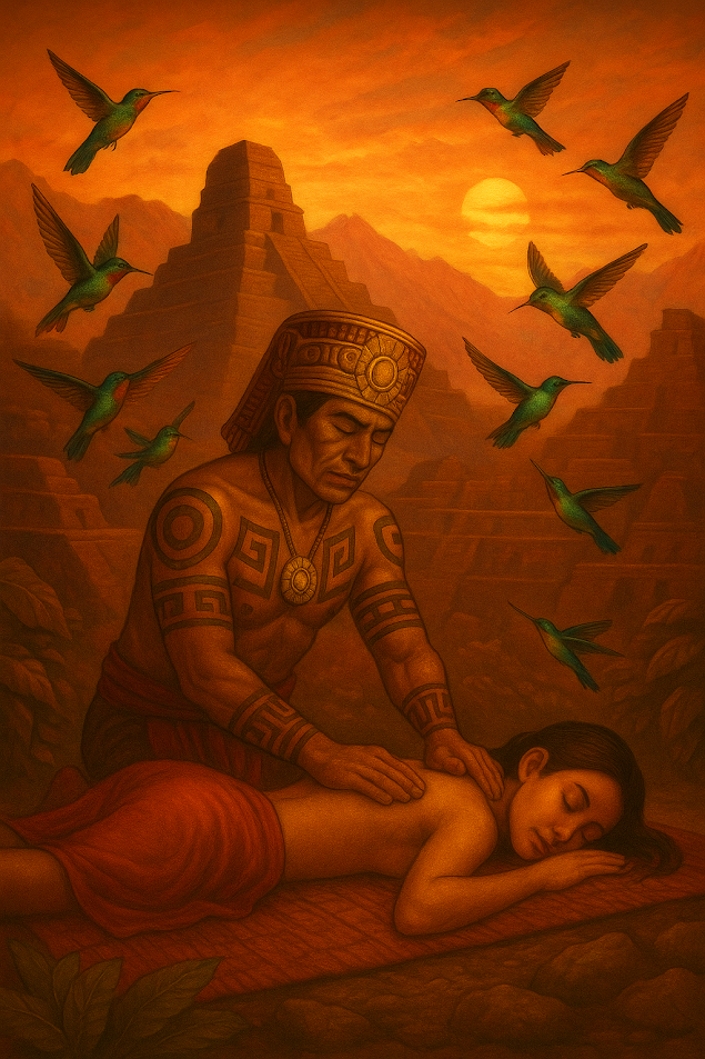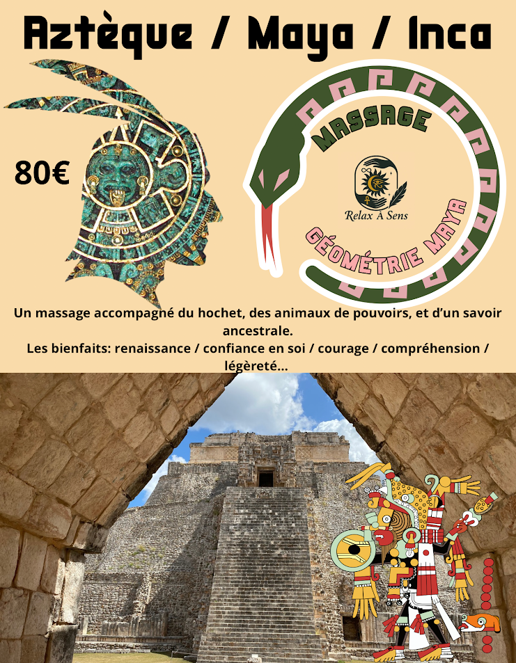 Le masseur, dans un souffle, commence à tracer sur ta peau les lignes d'une géométrie sacrée Maya. Tu sens les symboles s'animer, résonner au rythme de ton cœur. Puis son hochet résonne, vibrant d'une énergie cristalline. Tout se met à danser à l'intérieur de toi.