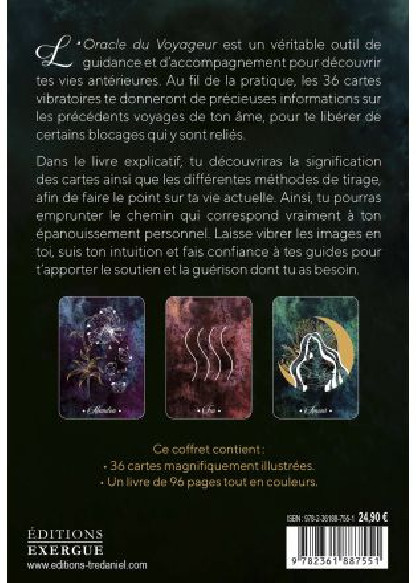L'Oracle du Voyageur est un véritable outil de guidance et d'accompagnement pour découvrir tes vies antérieures. Au fil de la pratique, les 36 cartes vibratoires te donneront de précieuses informations sur les précédents voyages de ton âme, pour te libérer de certains blocages qui y sont reliés.