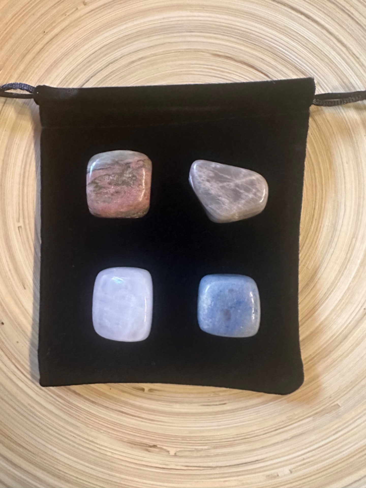 Sac médecine en feutrine noire contenant 4 pierres roulées (sélectionnées par mes soins):